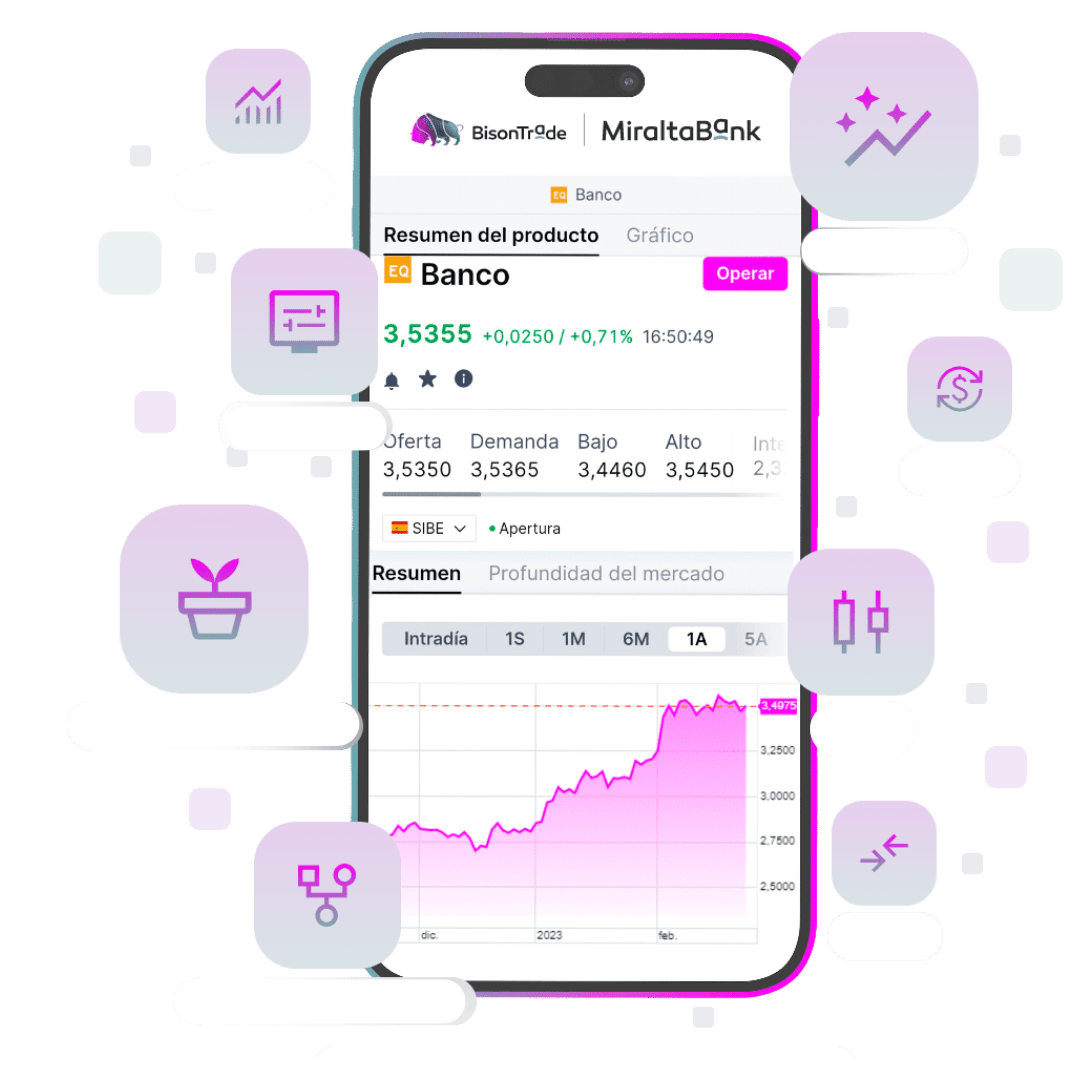 Bisontrade es la marca comercial bajo la que Miralta Finance Bank, S.A. ofrece los servicios de su bróker online. El cliente contrata con Miralta Finance Bank, S.A. Miralta Finance Bank, S.A. Inscrita en el Registro Mercantil de Madrid, al Tomo 42.320, Folio 21, Hoja M-480937, Inscripción 41ª. CIFA06302657. Domicilio social sito en Plaza Manuel Gómez Moreno, 2, Planta 17-A, Edificio Alfredo Mahou, 28020 Madrid, España. www.miraltabank.com. Inscrita en el Banco de España como entidad de crédito con el número 0244.